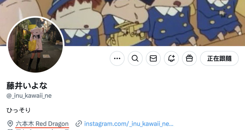 何以見得?一來是她有放上最近的照片,可以確定是本人沒錯;二來她有在新的帳號上抱怨說自己的名字被註冊走了,只能用「狗真可愛(inu_kawaii_ne = 犬可愛いね)」為ID重啟社群;最後也是最重要的事她為什麼要重拾「藤井いよな(藤井一夜)」的名字?這點從她在X上的自我介紹就明白了,看到「六本木 Red Dragon」了嗎?這下真相大白了,現在的藤井いよな(藤井一夜)是ー