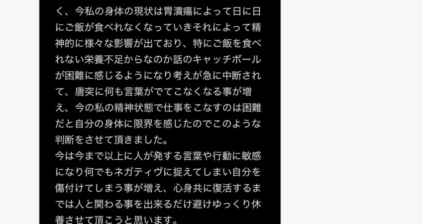 到底有多嚴重?笹本ゆう(笹本優)說她現在已經沒辦法正常飲食,精神也變得很差,無法正常思考,甚至有時候會講不出話來,不要說更新社群了,她連工作都快做不下去了,所以才選擇暫停更新社群ー而且不只是網路上的交流,為了避免負面情緒蔓延,她也明白表示會遠離人群,安靜地、獨自地好好療養,希望儘快恢復正常⋯