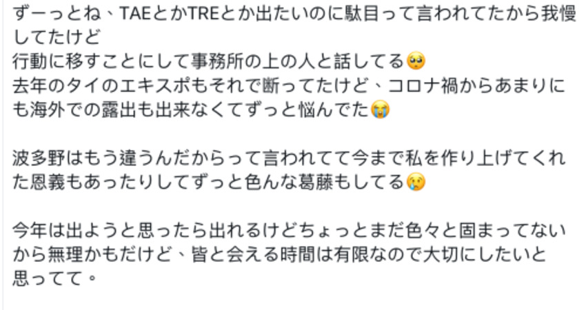 波多野說,她一直很想參加TAE及TRE的活動(註:這是台灣的兩個成人展),但始終不得其門而入,所以今年她決定主動出擊,和事務所高層聊聊這件事ー因為她很清楚,肺焱疫情後自己在海外的曝光就變得很少很少,讓她非常苦惱,雖然事務所和她說現在和以前不一樣了,但她還是想要試試: