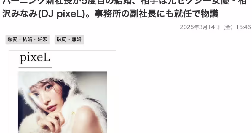 然後她就傳出來結婚的消息,成了日本演藝圈的焦點:因為現在叫pixeL的她結婚的對象是演藝圈著名經紀公司バーニングプロダクション的社長「周防彰悟」,今年49歲,這間經紀公司擁有像是鄉ひろみ(鄉廣美)、内田有紀以及稲森いずみ(稻森泉)等知名藝人,而婚後的pixeL這則是直升這間經紀公司的副社長、同時也在老公擔任大股東的琉球高爾夫俱樂部的營運公司擔任重要職位: