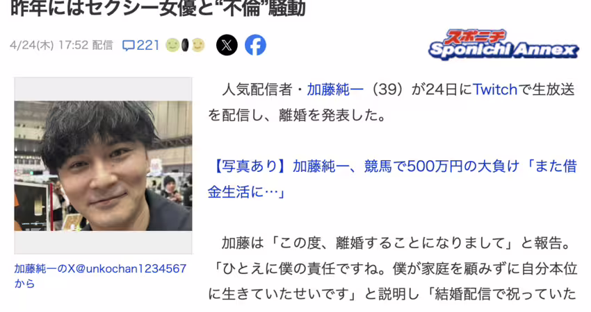他就是之前和本鄉愛爆出不倫醜聞的男主角,我簡單把事情再說一遍:他,加藤純一,是日本知名的直播主,去年9月,已婚的他被爆與本鄉愛同遊美國加州,在道奇球場被拍到一起為大谷翔平加油的照片,然後本鄉愛在社群公開道歉,自此無限期休業,X(https://x.com/ai_hongo_)再也沒有更新~