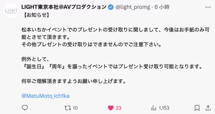 經紀公司「LIGHT」是在官方X(https://x.com/light_promg)宣布,從即日起松本いちか(松本一香)的活動上不再收禮,只接受卡片和信件…