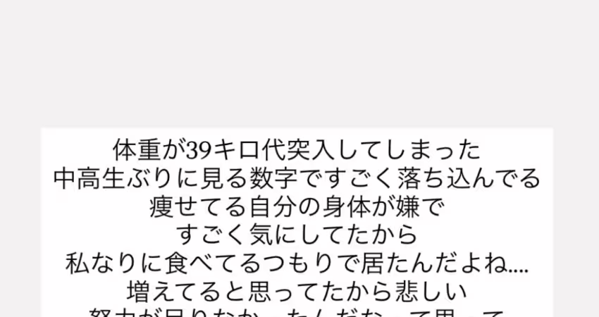 她說「很討厭自己一直變瘦的身體」,雖然以為自己有好好吃飯、體重應該會慢慢回升,不過站上體重計看到39公斤的數字真的很沮喪,覺得都是自己不夠努力ー
