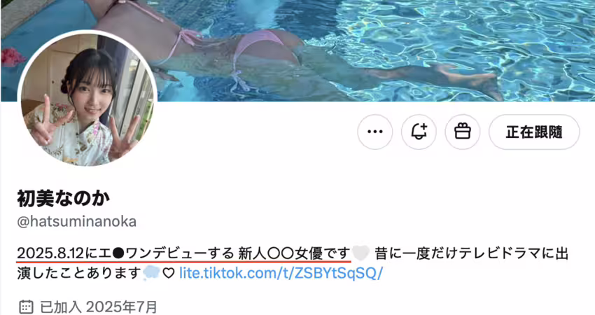 為什麼這麼說?因為這位「初美なのか(初美菜乃花)」在X(https://x.com/hatsuminanoka)的自我介紹欄說了,她是「2025.8.12にエ●ワンデビューする 新人〇〇女優です」,請讓吃了哆啦A夢翻譯蒟蒻的我來解釋一下: