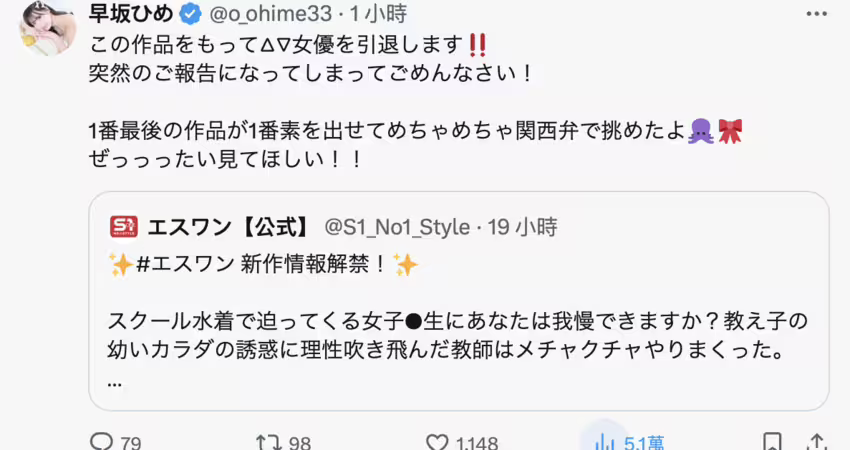雖然作品沒有不對勁,不過早坂ひめ(早坂姬)本人已經在社群上宣布了這個殘酷的事實,即將在9月發售的這支作品「スクール水着で迫ってくる女子●生にあなたは我慢できますか?教え子の幼いカラダの誘惑に理性吹き飛んだ教師はメチャクチャやりまくった。」就是她生涯的最後一支作品,短期內不會復出了: