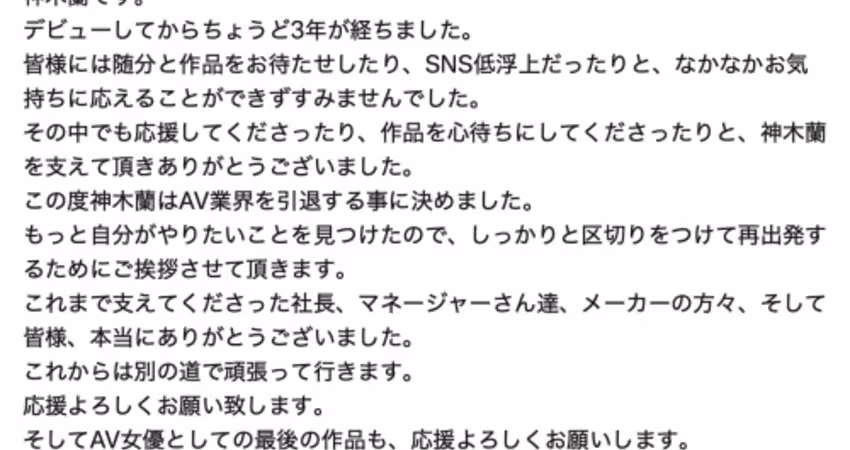 經紀公司エイトマン(8MAN)出身、片商Faleno Star專屬出道的八頭身黃金比例女優「神木蘭」發表了引退宣言,她說自己已經出道三週年了(2022.9~),一直讓大家等待新片、社群也不太更新真的很抱歉,這些日子感謝大家的支持與陪伴,但,她決定自AV界引退惹〜