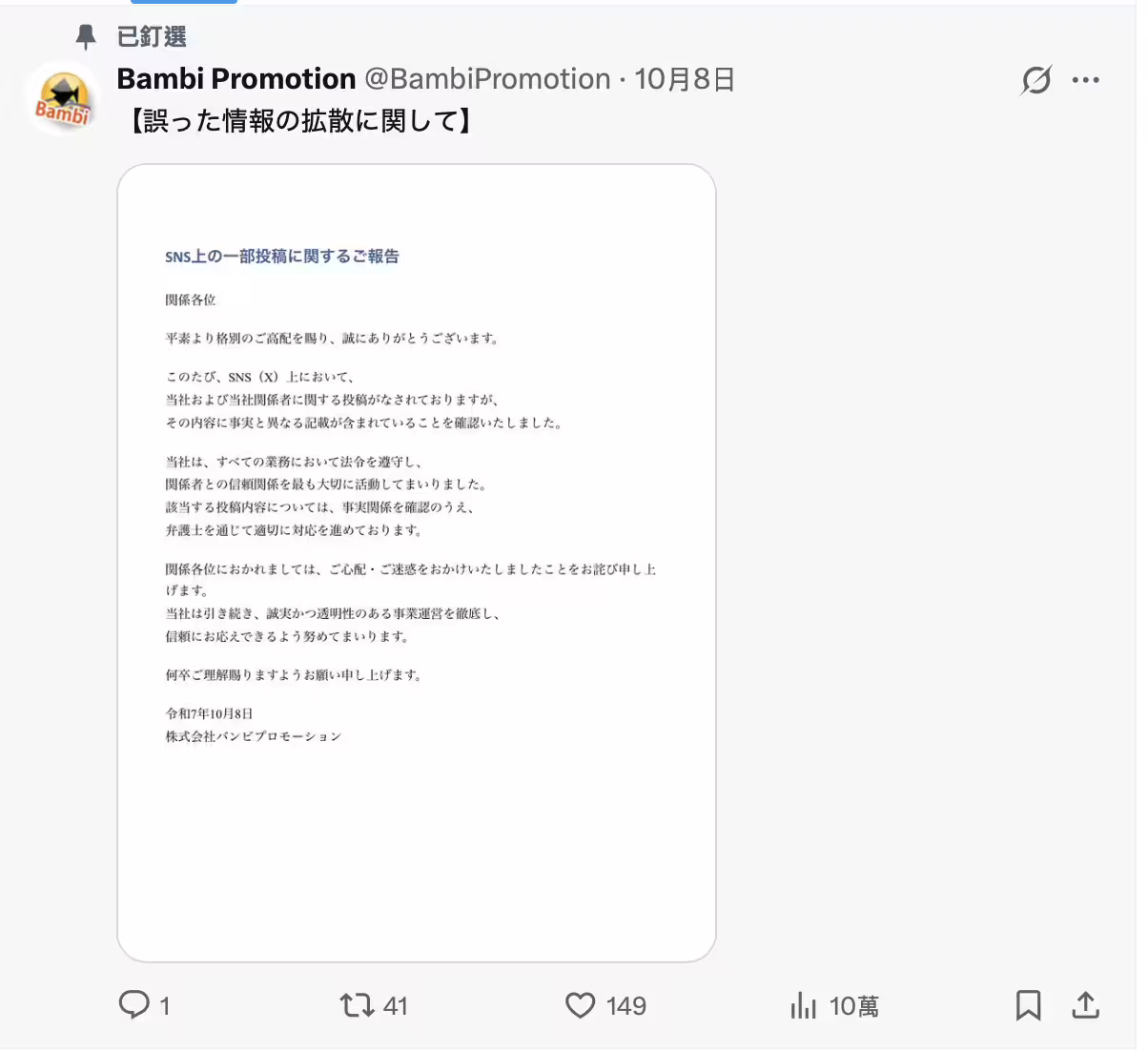所以她不能忍。那事務所怎麼說呢?在前天(10/8),藍芽みずき(藍芽水月)所屬的經紀公司在官方X(https://x.com/BambiPromotion)發表公開聲明,雖然完全沒有提到藍芽みずき(藍芽水月)的名字,甚至也沒講出與女優爆發了酬勞的糾紛,但大家都知道,這就是回應藍芽的指控ー