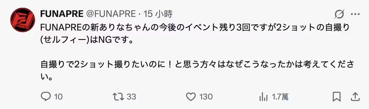 新ありな(新有菜)向來是很寵粉的,不只合照的時候貼得很近也會盡可能地滿足粉絲的要求,所以活動完你會看到很多有趣的合照姿勢,所以這次直接禁止自拍肯定是發生很嚴重的違規行為⋯