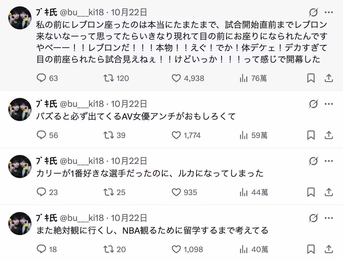 當然是開心開心真開心,葵いぶき(葵伊吹)說以後還要再現場觀戰看NBA,甚至動了要留學以便常常現場看球的念頭(她也真的有去查留學的費用);然後對於能坐在LBJ後面她也是又驚又喜,直說這位沒有上場的老漢真的超魁梧有夠大隻的;最後,她說以前最喜歡的球員是Curry,現在換成Luka Dončić了⋯