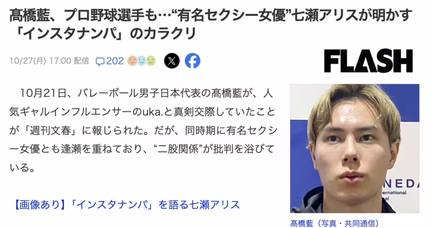 雖然八卦雜誌的文春炮是上禮拜的事了,不過還是有很多人好奇,從末広純(末廣純)到河北彩伽,是用什麼管道和那些高大威猛的職業球員搭上線的?我是覺得有人在仲介,不過七瀬アリス(七瀨愛麗絲)是這麼說的: