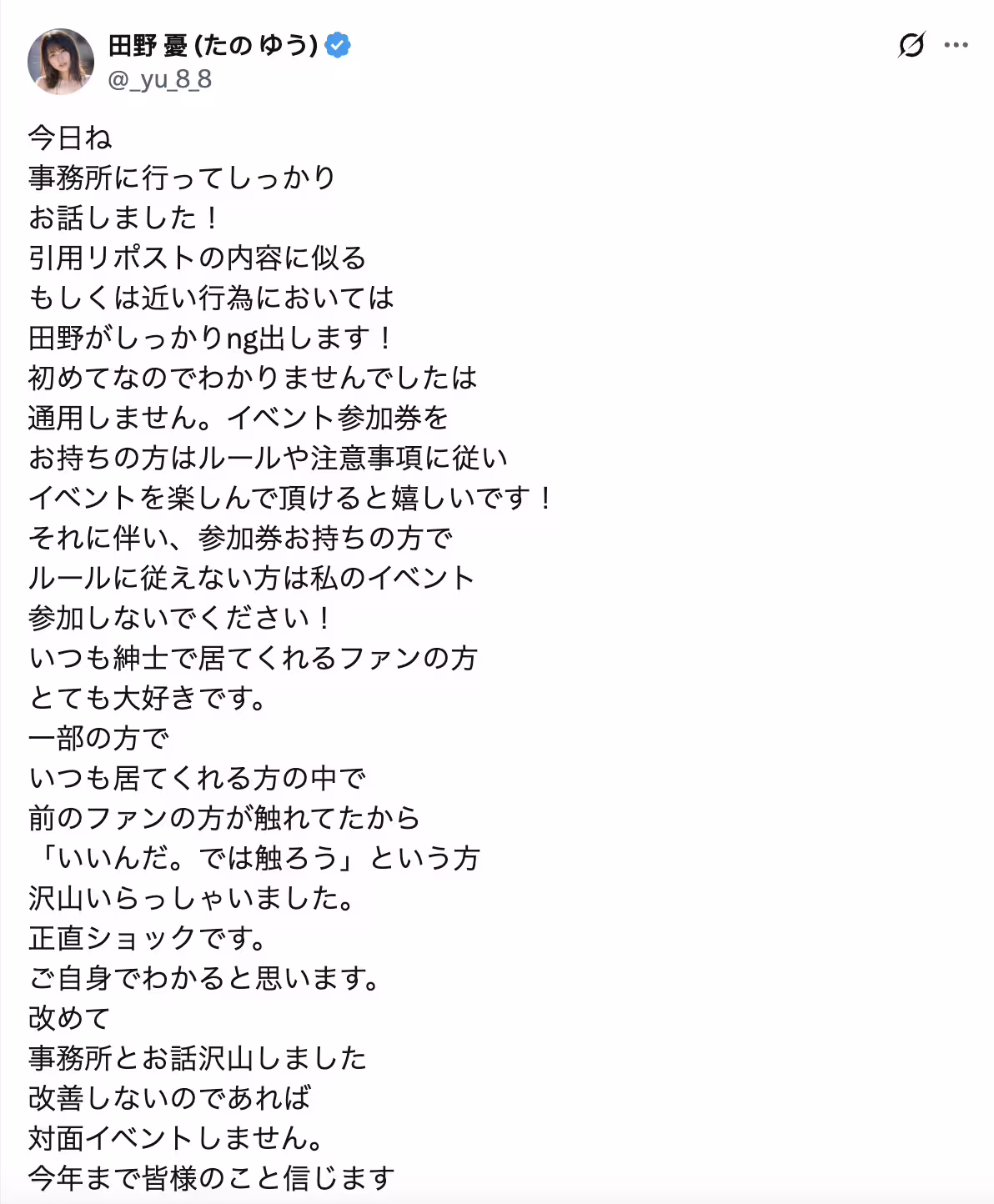 於是在與事務所商量後,田野憂決定要好好宣導,不應該的做的事情不要做,如果控制不住自己的鹹豬手,那就別來活動了,假如犯規的人太多,那她就不辦活動了ー對我們而言,身為活動的主辦單位,保護女優是我們的責任,我尊重每一位選擇這份工作的女優也希望大家都能以禮待之,就像田野憂所說,如果你想亂來的話,風俗店可以好好摸個夠,女優的活動請務必自制,謝謝。