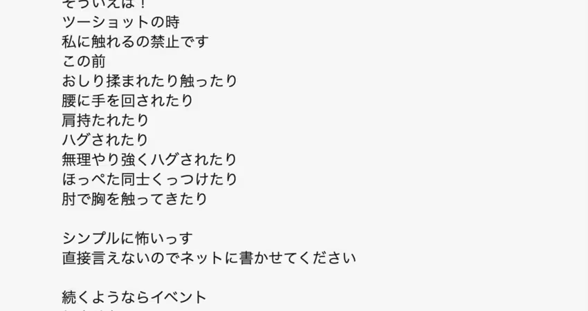 簡單來翻譯一下田野憂寫了什麼:她是呼籲粉絲在合照的時候「別碰我」,因為在之前有人揉她的屁股、從後面揉她的腰、把手搭在她的肩上、強行擁抱她、故意臉貼臉以及用手肘觸碰她的胸部⋯田野憂說,上述的行為真的讓她覺得很可怕,但她沒有辦法當面說出來,只好在社群上發發牢騷: