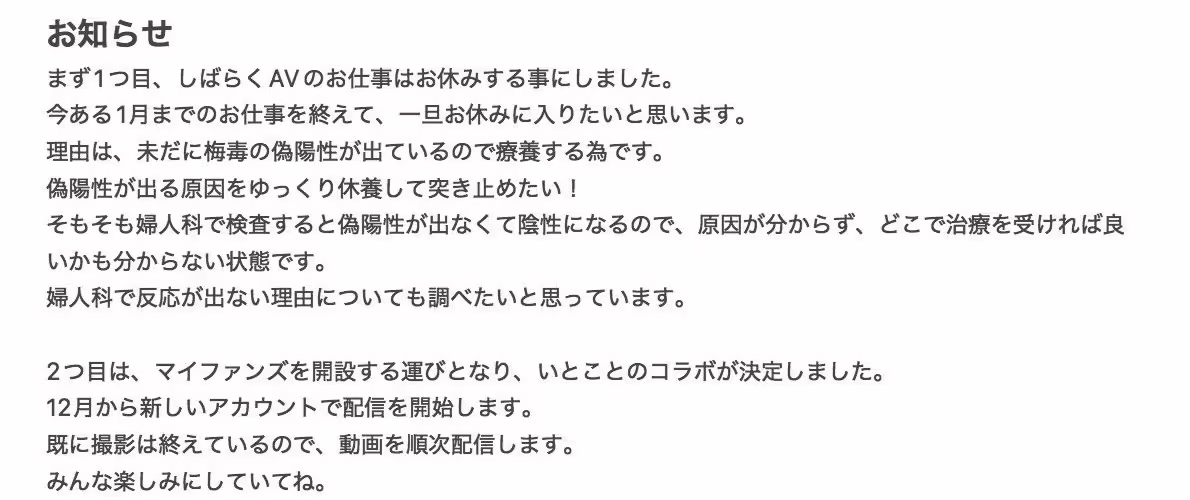 發生了什麼事嗎?很意外地,武藤あやか(武藤彩香)很詳細地寫了出來,原來是她的梅毒檢測持續出現偽陽性的結果,需要好好治療休養ー武藤あやか(武藤彩香)說想要把一直出現偽陽性的原因找出來,然後暫停AV的工作調養身體⋯
