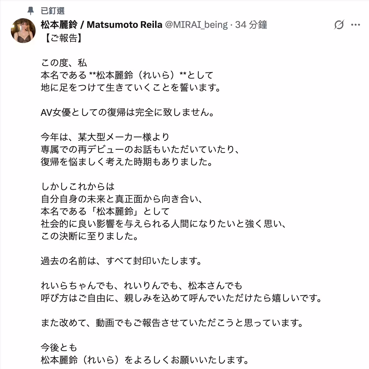 所以她不會復出了,從現在開始,她就只是「松本麗鈴」,至於未來要做什麼,她會再拍影片和大家報告⋯