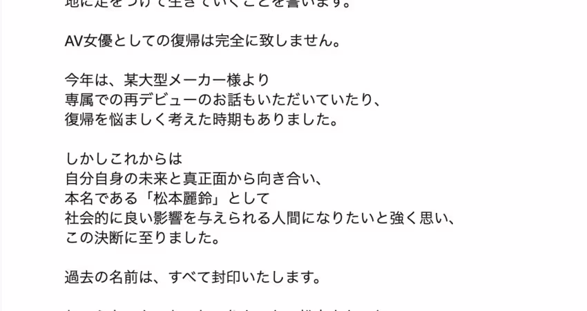 意思是她不會再當AV女優了。不過話鋒一轉,現在叫松本麗鈴的她表示,今年有收到某大型片商邀約復出,對方給的條件不錯,是專屬女優,讓她也為是否要復出而猶豫⋯