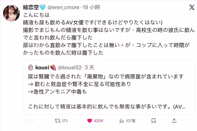 乾看到這裡我覺得這女生好妙喔,你說和男朋友做得很激動結果吞精飲尿我覺得完全沒問題,放在杯子裡一段時間的尿還去喝是幹嘛?不過從這兒也看得出來絵恋空不只敢講而且很敢,在社群發文都寫得那麼奔放了,面對面聊天肯定會有更多猛料〜