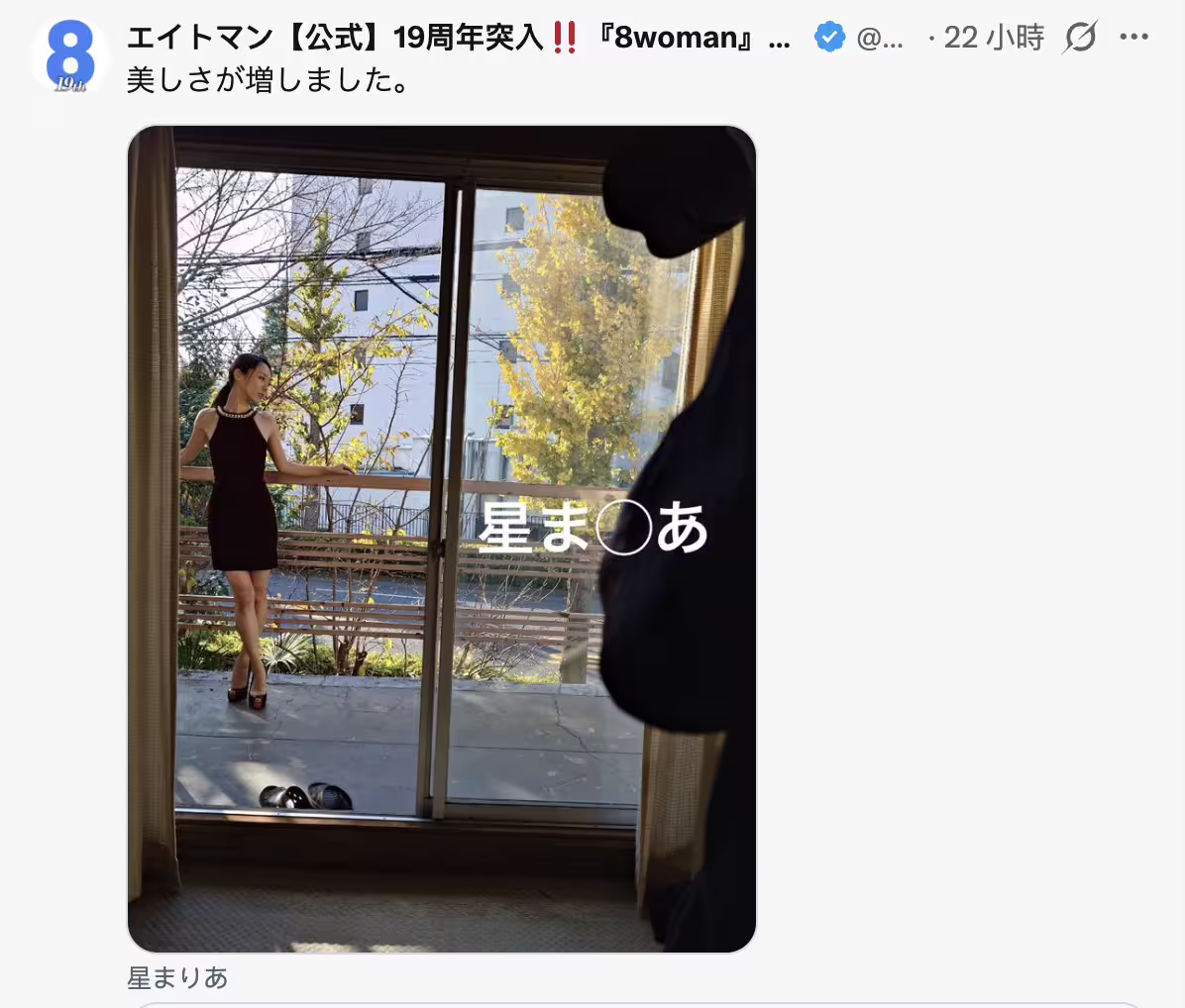 雖然在藝名上做了些處理,不過大家都知道エイトマン(8MAN)的答案是「星まりあ(星麻里亞)」,是的,那位以天音まひな(天音真比奈)之名出道、後來更換經紀公司換了藝名但只在頂級片商S1發了兩支作品及一支VR,在2023年5月就再也沒有作品的星まりあ(星麻里亞)又再一次出現在經紀公司エイトマン(8MAN)的社群,而且這次明確地指出她在工作: