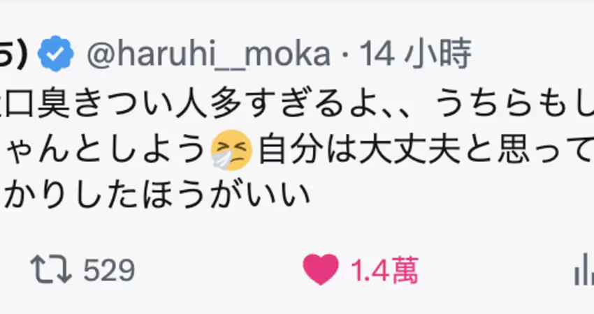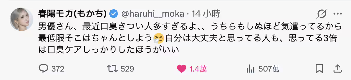 希望文章發出來後,春陽モカ(春陽萌花)不會再碰到口氣難聞的男優,其實去除口臭應該不難,好好刷牙,再用牙線做好後續清潔,上場前再用漱口水應該可以消除難聞的氣味;而在知道女優在意口臭這回事後,雖然我們不是男優不用和她們舌吻,但在參加活動的時候也可以稍微做一下清潔工作,互動前使用漱口水,如果很會流汗就帶件衣服去換,就算女優記不住人,但至少不會留下「很臭」的印象⋯