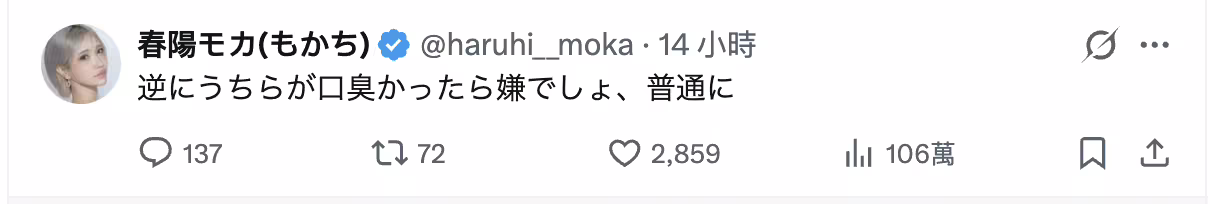 因為沒有指名道姓,所以春陽モカ(春陽萌花)話講得很直接,其實想想也是,你說雞雞很臭還不是要吃?但至少那邊清潔容易,而且很多片商全程使用保險套,有味道也沒那麼重;但嘴巴這種一張嘴就傳來的味道真的會讓一些女優受不了,雖然一切的一切都可以用「敬業」兩字克服,不過從春陽モカ(春陽萌花)的發文就知道她真的受不了了⋯