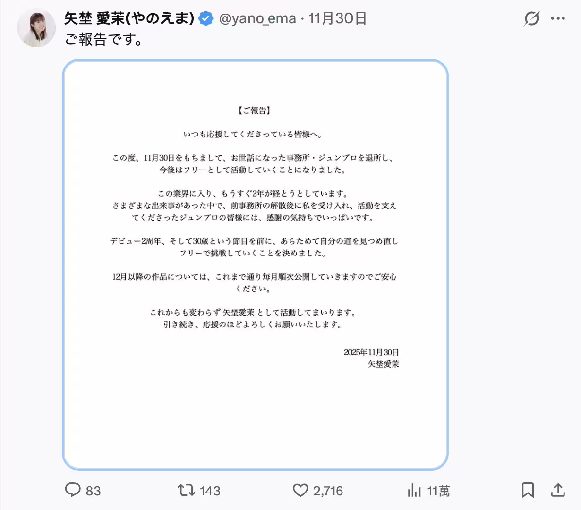 她是在11月底的時候於社群(https://x.com/yano_ema)發表聲明,宣布離開了事務所ジュンプロ(JunPro),將來將以自由之身(フリー)繼續活動⋯