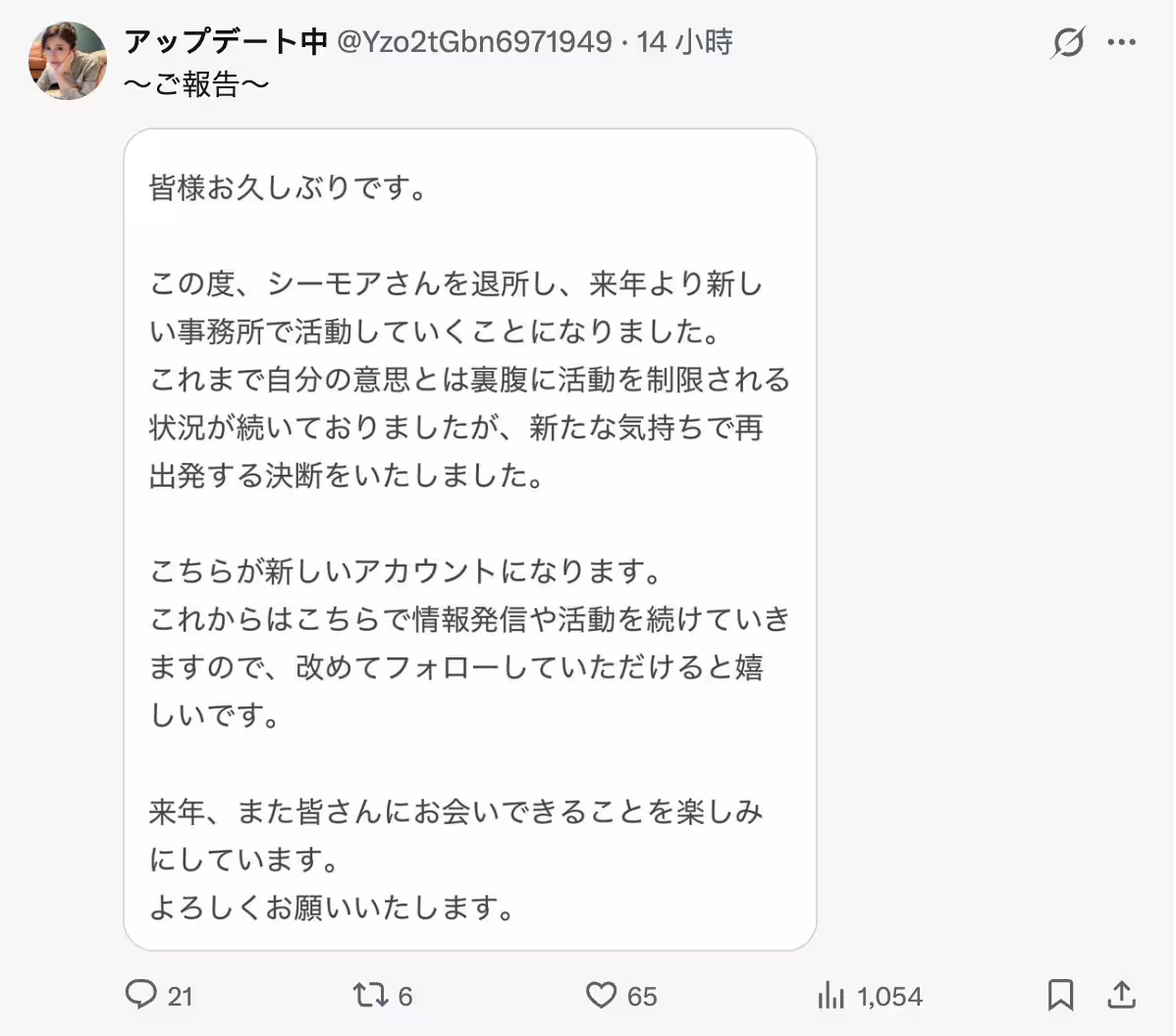 她說自己離開了原事務所C-More,明年(2026)開始會在新的事務所展開活動,所以她要把原先的帳號關閉了;至於她為什麼要轉換經紀公司?之前叫設楽ゆうひ(設樂夕日)的她說詳細狀況無法多談,因為有些事情和她想像的不同、再加上外部情勢演變以及第三者的介入所以這陣子她什麼事都沒辦法做,心理也備受煎熬⋯