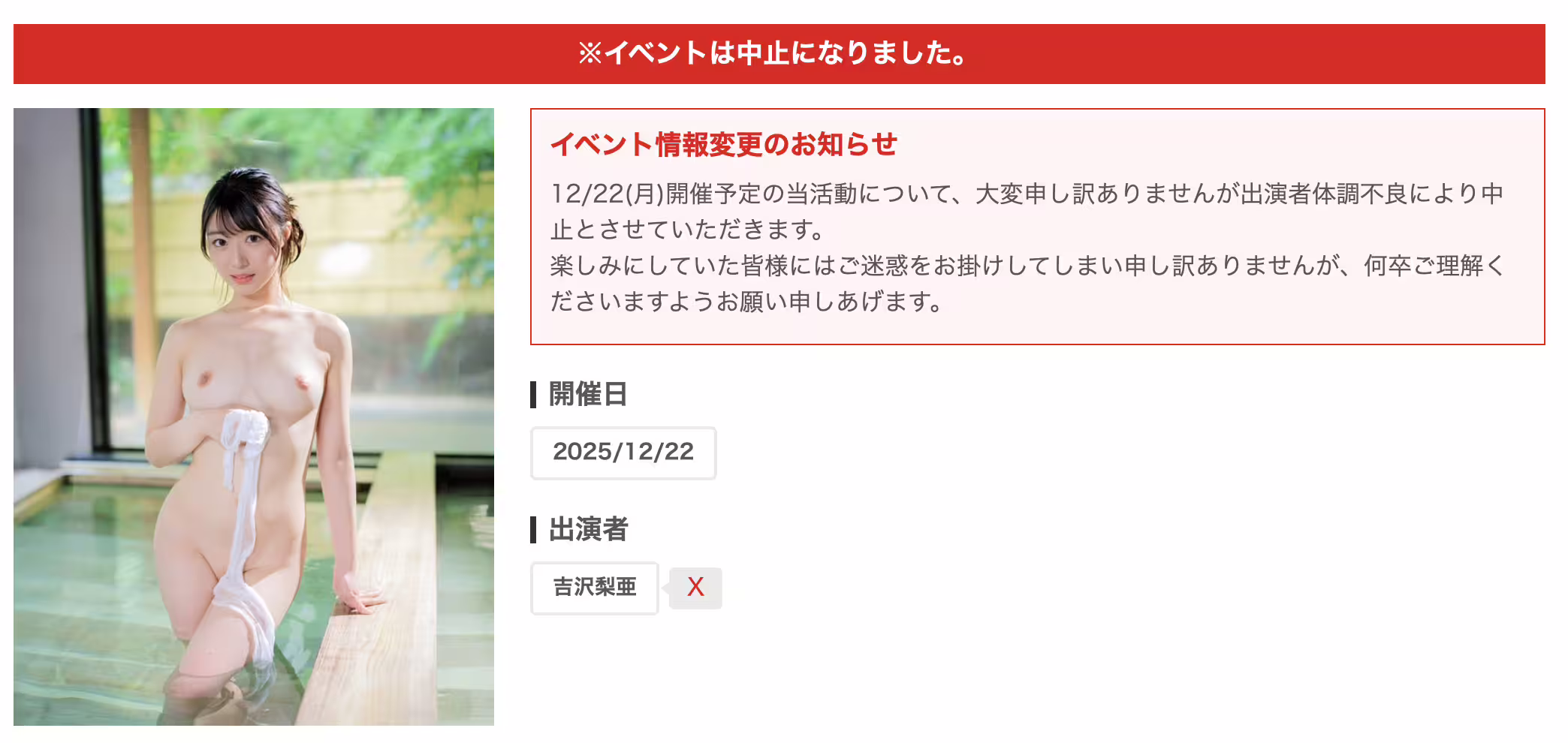 雖然女優突然消失從來不是新鮮事,但吉沢梨亜(吉澤梨亞)真的出人意料:大家都知道2025年的最後兩個月正是Faleno集團大張旗鼓舉辦大感謝祭見面會活動的時候,吉沢梨亜(吉澤梨亞)雖然不是開頭也不是壓軸出場的女優,不過她可是Faleno集團的宣傳大使,除了在10月份擔任一日店長的活動外,在這次的大感謝祭活動中她也扮演吃重的角色ー片商不是笨蛋,會把宣傳大使的任務交給吉沢梨亜(吉澤梨亞)一定是因為她有人氣也夠穩定、不會隨便出亂子,但偏偏不出意外的話就出意外了,吉沢梨亜(吉澤梨亞)說沒了就沒了: