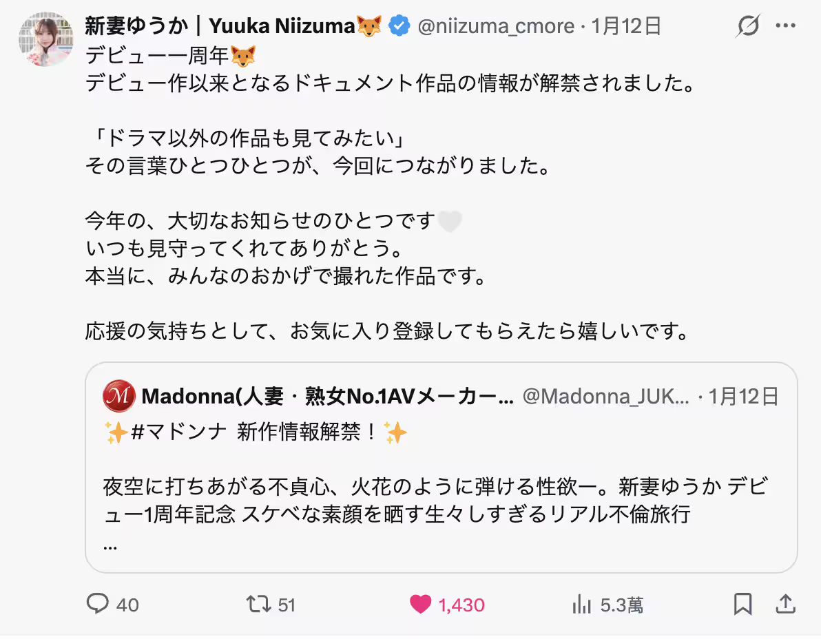 對女優來說這應該是最容易演出的類型,由於Madonna的DVD長片不太拍這類型的作品,所以對新妻ゆうか(新妻優香)及其粉絲來說都是蠻新鮮的體驗ー至於成為AV界的二年級生之後呢?首先,接髮一直過敏的她應該很快就要有短髮的作品了,再來,矢志要留出長髮的她頭髮正在慢慢變長中,2026年應該可以看到她造型不斷變化,肯定很有趣,當然,海外活動也不會少,敬請期待!