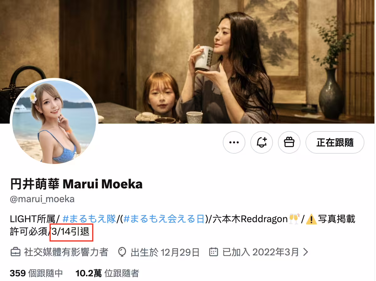 至於社群呢,円井萌華(圓井萌華)說3月14號引退後就會刪除,所以如果大家捨不得的話現在就要趕快備份了ー由於她並沒有發布正式的引退聲明,所以這些訊息都是在最近的發文拼湊出來的 也許有人會覺得円井萌華(圓井萌華)這樣處理引退的方式有點草率,但我覺得這位從小時候就開始當模特兒、也在偶像時期來過台灣的女優看得很開,從2022年五月初到到現在也差不多四個年頭了,該結束的時候就是要結束了⋯
