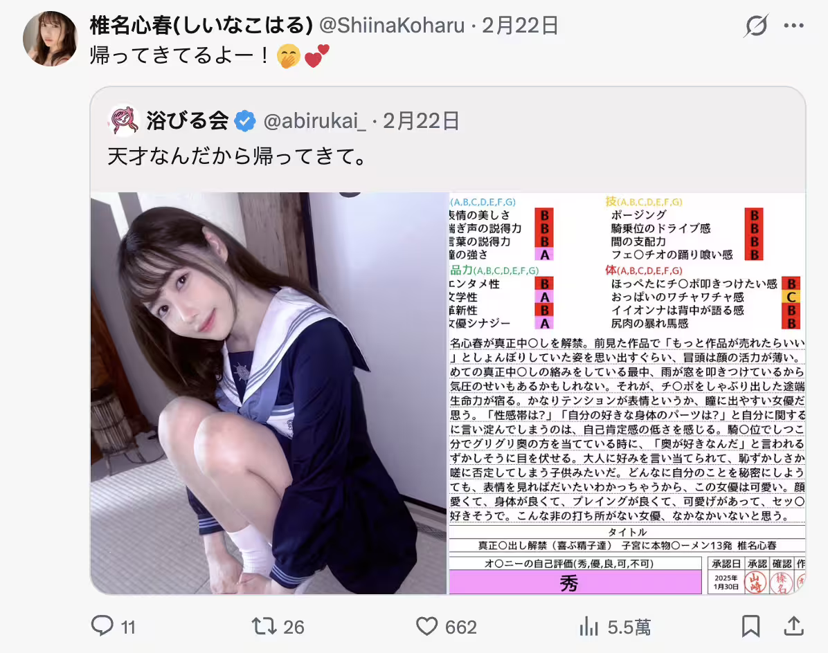 一塊兒來看看社群上的一篇文章,椎名心春是轉推了某部落客對她作品「真正中出し解禁(喜ぶ精子達) 子宮に本物ザーメン13発」的評論,然後告訴大家ー